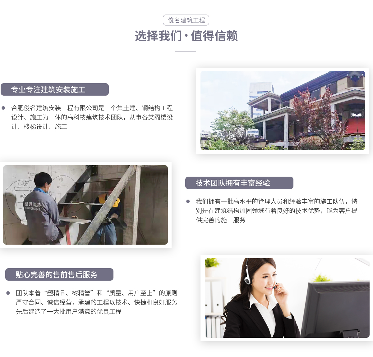 - 合肥俊名建筑安裝工程有限公司是一個(gè)集土建、鋼結(jié)構(gòu)工程設(shè)計(jì)、施工為一體的高科技建筑技術(shù)團(tuán)隊(duì),從事各類閣樓設(shè)計(jì)、施工。我們擁有一批高水平的管理人員和經(jīng)驗(yàn)豐富的施工隊(duì)伍,特別是在建筑結(jié)構(gòu)加固領(lǐng)域有著良好的技術(shù)優(yōu)勢(shì)。團(tuán)隊(duì)員工精誠(chéng)團(tuán)結(jié),以“尊重規(guī)范,拒絕平凡”為宗旨,為客戶提供完善的施工服務(wù)。團(tuán)隊(duì)本著“塑精品、樹(shù)精譽(yù)”和“質(zhì)量、用戶至上”的原則,嚴(yán)守合同、誠(chéng)信經(jīng)營(yíng),所...